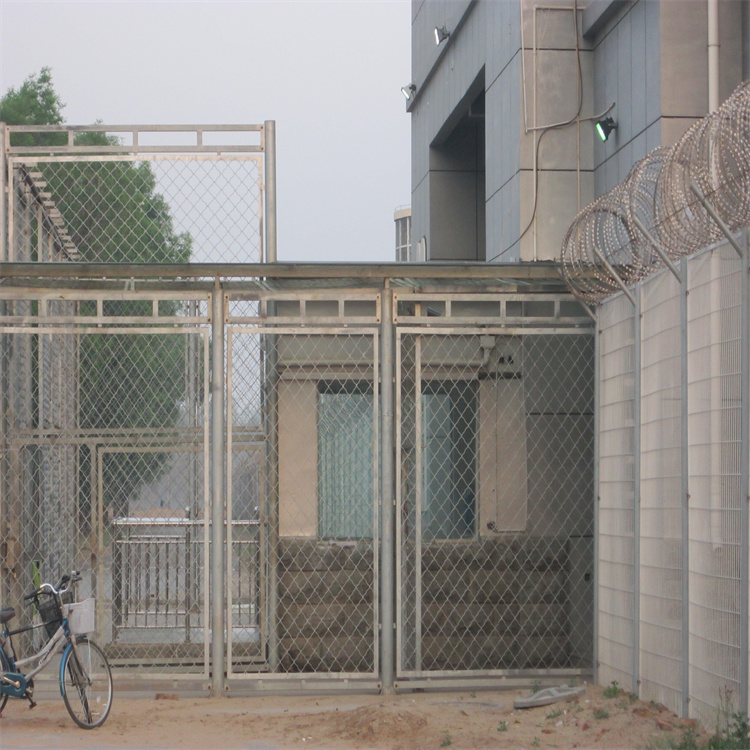監(jiān)獄鋼網(wǎng)墻一般頂端都設(shè)有V型支架與立柱焊接。材料通常選擇和立柱同等材料或者稍小規(guī)格材料搭配使用。V型支架的加裝是為了將蛇腹形刀刺網(wǎng)固定在鋼網(wǎng)墻頂部,從而有效的增加監(jiān)獄鋼網(wǎng)墻的防攀爬性和安全性。V型支架加裝防拆卸刀刺網(wǎng)。刀刺網(wǎng)的直徑-般為