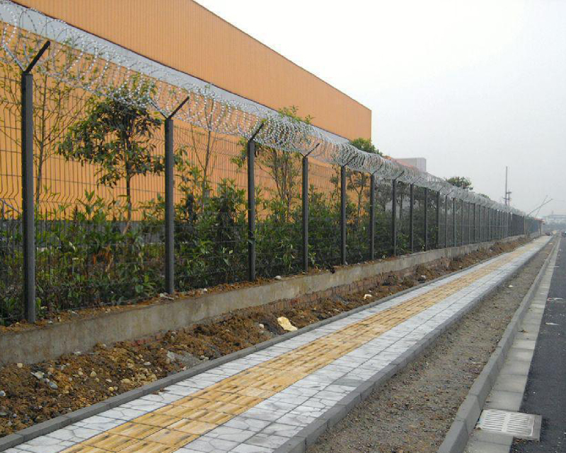 在***個水平地面上開始挖坑,根據(jù)確定的線每2.5米挖300x450x500mm深的坑,然后倒入嵌入式零件。法蘭的上表面距離地面50mm,因此可以用水泥密封焊接點,以實現(xiàn)更好的腐蝕防護,焊接網與立柱,刀片鐵絲網,螺栓和其他配件一起到達施工現(xiàn)場,立柱垂直于地面,立柱的中心距離嚴格控制在2500+/-5mm (一種更好的方法是使用一塊焊接網作為標準,以確定每個立柱的位置),同時注意立柱的高度和V形支架的方向應保持一致,監(jiān)獄隔離網的所有部件均應滿足防腐,光滑表面,***老化,***酸堿的要求,并且不褪色。