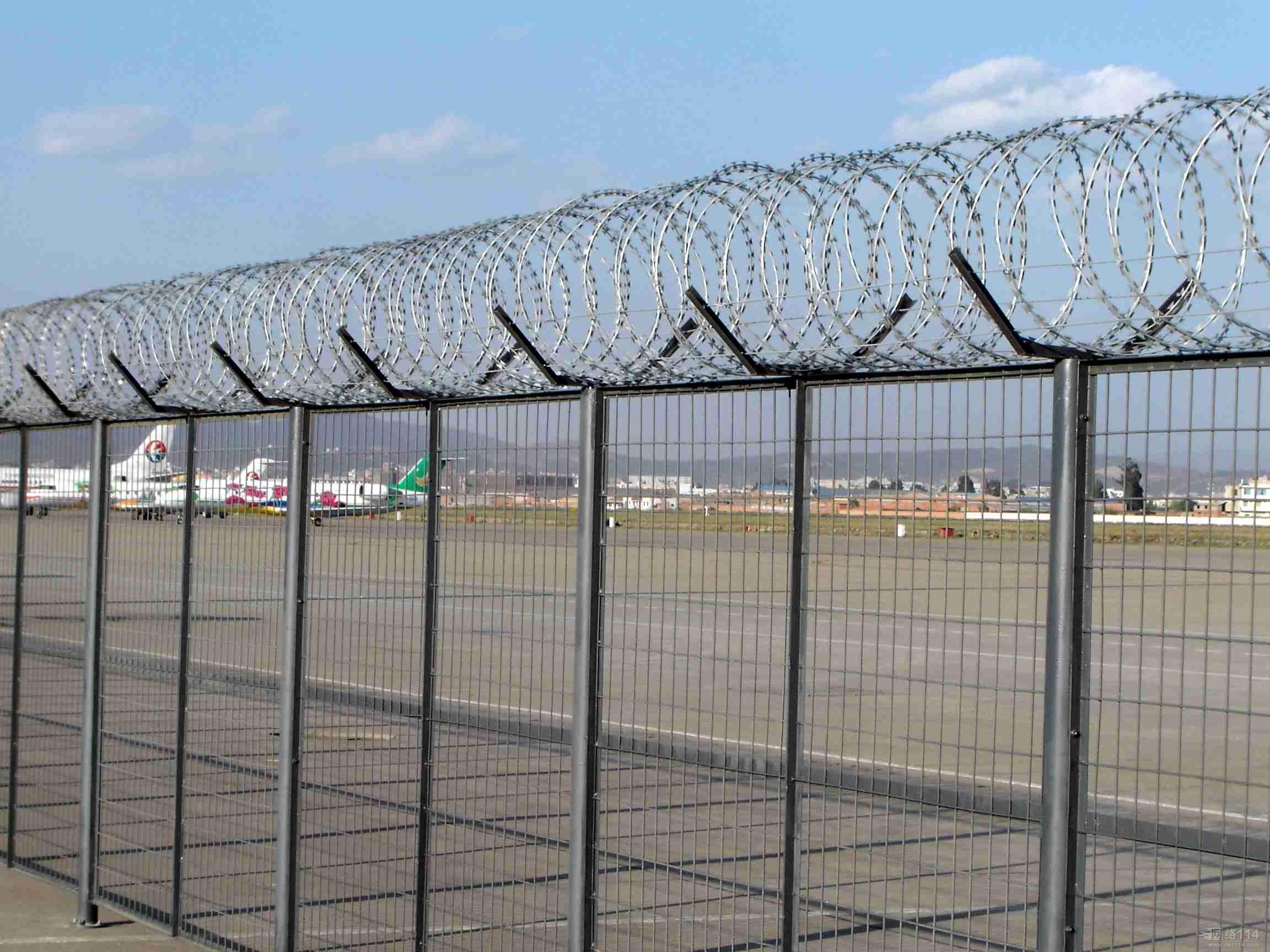 安平縣艾瑞金屬絲網(wǎng)有限公司生產(chǎn)機(jī)場(chǎng)隔離網(wǎng),飛機(jī)場(chǎng)圍界網(wǎng),機(jī)場(chǎng)圍欄網(wǎng)又稱作“Y型安全防御護(hù)網(wǎng)”,是由V型支架立柱,加強(qiáng)型焊接網(wǎng),安全防盜連接件和熱鍍鋅刀片刺籠組成強(qiáng)度和安全防御性級(jí)別很高。