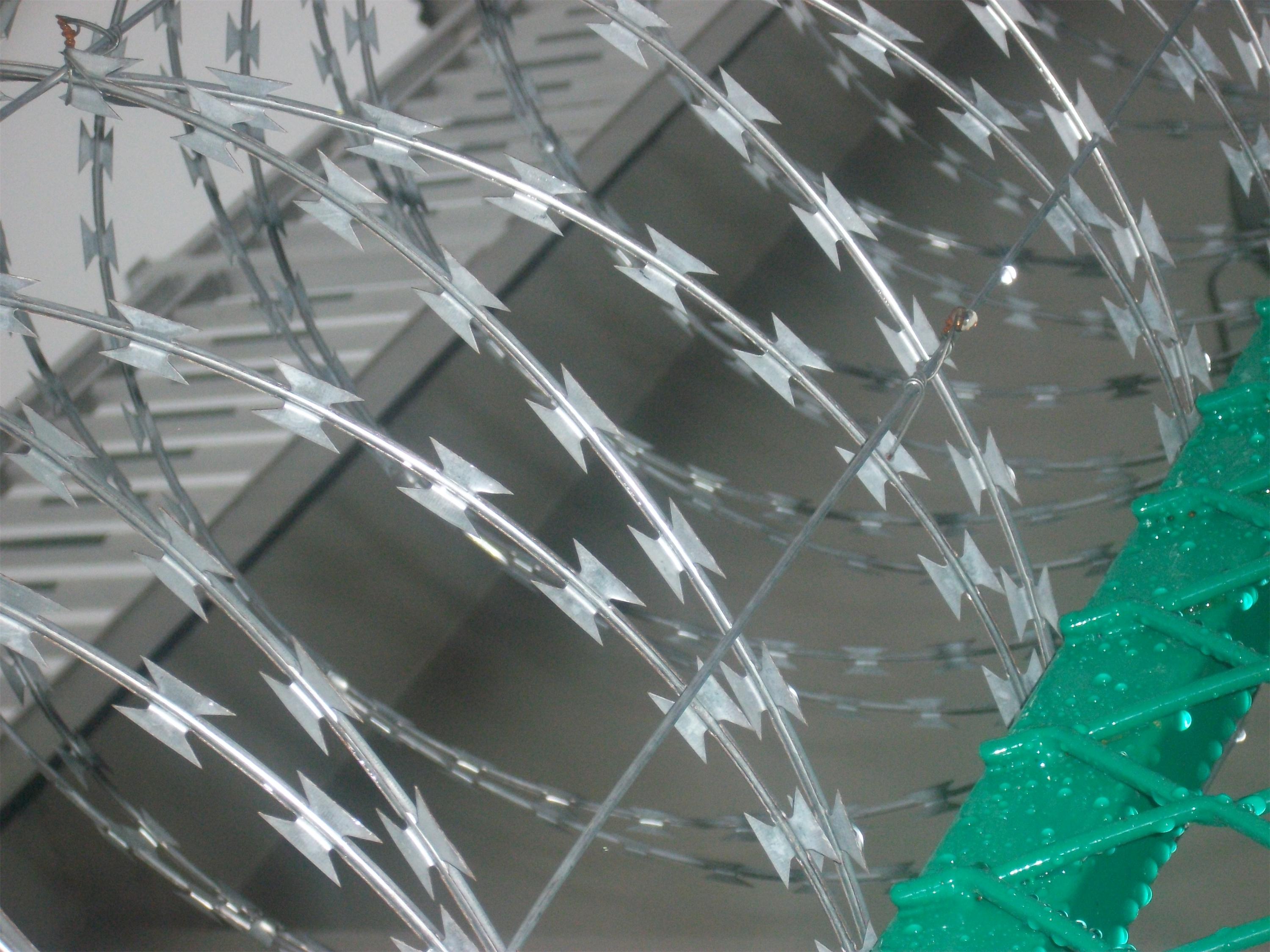 斧型刺刀圈的產(chǎn)品知識是一種新型防護網(wǎng),由銳利尖角刀片和芯線組成,刀刺、刀型整文、刀片銳利、排列均夕致密、連接牢固。強度和安全防御性級別很高,鋼筋網(wǎng)圍界刺鋼絲采用斧型刺刀圈,刺刀圈內(nèi)芯為直徑2.5mm的冷拔低碳鋼絲并經(jīng)防腐處理,表面熱鍍鋅。安裝刺刀圈與頂部V形延伸警用不銹鋼卡子連接,沿長度方向每隔500mm設(shè)4個卡子連接,拉強度大于1450N/mm,特點:刀型整齊斧型刺刀圈規(guī)格: 刀片為BTO-22刀型,直徑為50、60cm、70cm,刀片鋒利,排列均勻、致密,連接牢固,防腐能力強、可達到防翻躍、防拆卸高安全防護等級。