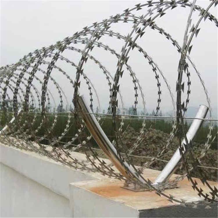 第二種,在安裝的過程,可根據(jù)圍墻的長度設(shè)計需要使用多少根Y字支架,一般以5-10cm的間距為好,把Y字型支架固定在圍墻上面,其中Y字形支架可根據(jù)您的實際情況進(jìn)行打孔,以此為了安裝刀刺網(wǎng)的時候起到固定的作用。然后刀刺網(wǎng)的Y字支架上兩邊各拉一根鋼絲,對刀刺網(wǎng)加以固定,以免左右搖晃。