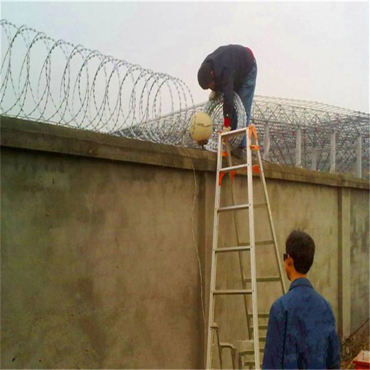 刀片刺繩隔離柵(razor wire fence)是一種常見的防護隔離設(shè)施,主要用于圍墻、柵欄、邊境、監(jiān)獄、軍事設(shè)施等場所,以防止非法入侵、攀爬和闖入。刀片刺繩隔離柵由帶狀鋒利金屬絲制成,這些金屬絲相互交叉并固定在支柱或柵欄上,形成一道難以攀爬和穿越的屏障