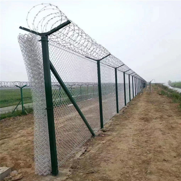 鋁包鋼機場圍界主要用于機場外圍的防護(hù)使用,是一種新型機場圍界防護(hù)網(wǎng),又被稱作鋁包鋼機場圍欄。鋁包鋼絲機場護(hù)欄具有獨具匠心的鋼絞線穿插式連接立柱和網(wǎng)片,由Y型立柱、鋁包鋼勾花網(wǎng)、鋁包鋼刺絲網(wǎng)組成。 鋁包鋼機場圍界具有美觀實用、防腐性好、無需保養(yǎng)、防攀爬能力強、方便運輸和安裝等特點,關(guān)鍵的是鋁包鋼絲機場護(hù)欄可以使用15年以上,強度可達(dá)600Mpa。主要適用于機場周圍的隔離防護(hù),美化及防翻越工程,目前基本都是定制生產(chǎn)