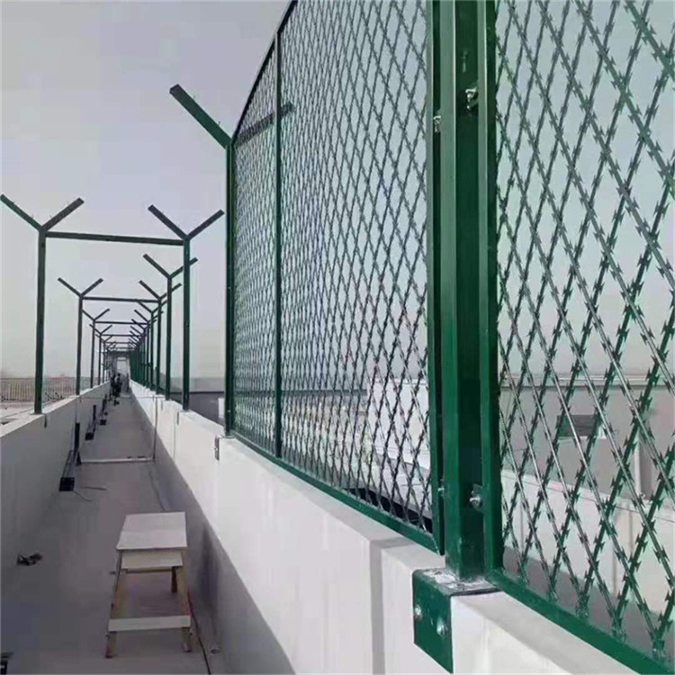 監(jiān)獄護欄是由立柱和網片組成,在網體頂部焊y型托架,圍圈盤放刀片刺絲,也有的在網體的上中下橫向,縱向,斜向交錯綁定刀片刺絲,能有效防止攀爬逃竄,這樣威懾力更大,防范效果更好。
