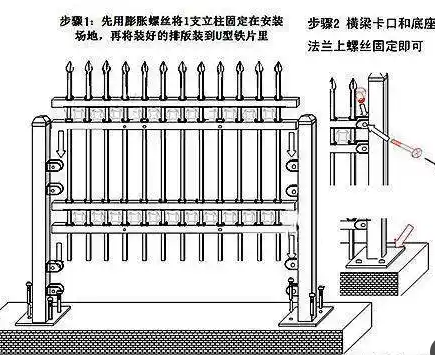 想要了解場地圍墻專用的鋅鋼護(hù)欄怎么安裝,就要先了解現(xiàn)在消費(fèi)者在購買圍墻用鋅鋼護(hù)欄時最青睞哪一種,通過我們這么多年的鋅鋼護(hù)欄銷售經(jīng)驗可以看出,現(xiàn)在熱鍍鋅方管制作而成的鋅鋼護(hù)欄最被消費(fèi)者青睞,這種被稱作鋅鋼護(hù)欄或鋅鋼圍墻護(hù)欄的產(chǎn)品,是由不同規(guī)格的熱鍍鋅方管拼接而成,整個制作過程中不需要焊接,這種鋅鋼護(hù)欄最常用的材料:橫桿:40*40mm熱鍍鋅方管; 豎桿19*19mm熱鍍鋅方管; 立柱:50*50mm熱鍍鋅方管,生產(chǎn)這種鋅鋼圍墻護(hù)欄時,只需要按照豎桿的規(guī)格尺寸在橫桿上開出合適的方孔,安裝時直接把豎桿插入橫桿上所開的空中。具體的組裝步驟如下圖所示