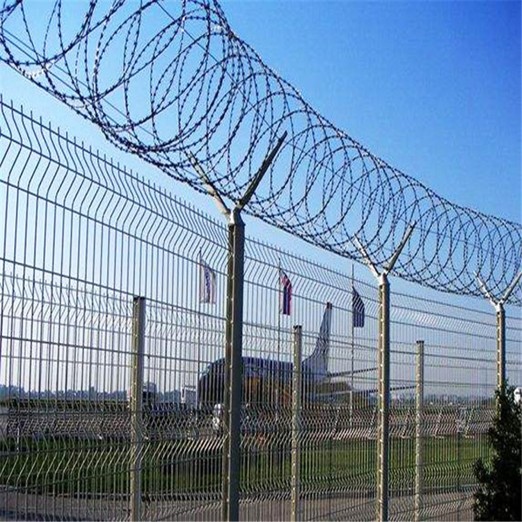 機(jī)場圍界是將機(jī)場飛行控制區(qū)與外界隔離的一道空防安全屏障,機(jī)場圍界通常由鐵柵欄或鐵絲網(wǎng)圍成,它擔(dān)負(fù)著保障飛行控制區(qū)安全的重任。圍界圍欄形式采用鋼筋網(wǎng)結(jié)構(gòu)形式,機(jī)場圍界又稱作“Y型安全防御護(hù)網(wǎng)”,是一種框網(wǎng)結(jié)構(gòu),由折彎網(wǎng)片,V型支架立柱,加強(qiáng)型焊接片網(wǎng),上面有刀片刺繩(又稱刀刺網(wǎng),刀片護(hù)網(wǎng))安全防盜連接件組成強(qiáng)度和安全防御性級(jí)別很高。框網(wǎng)結(jié)構(gòu)能夠提供更堅(jiān)固的支撐和更牢固的連接,難以被破壞??蚓W(wǎng)的結(jié)構(gòu)能夠有效地防止通過撞擊、破壞或攀爬等方式跨越,也能提供更好的視野和通風(fēng)效果。