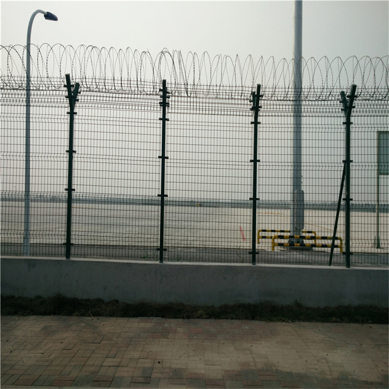 機(jī)場鋼筋圍界網(wǎng)頂部加裝刀片刺絲、刀片刺網(wǎng)后又很好的增強(qiáng)了安全防護(hù)性能。采用電鍍、熱鍍、噴塑、浸塑等防腐形式,具有很好的抗老化、抗曬、耐腐蝕等特點。其產(chǎn)品造型美觀、花色多樣,既起到圍欄作用,又起到美化作用。由于具有安全性高、防攀爬能力好,網(wǎng)片連接方式采用特制SBS緊扣件,有效防止人為的破壞性拆卸,橫向四道折彎加強(qiáng)筋,使網(wǎng)面強(qiáng)度顯著增加。