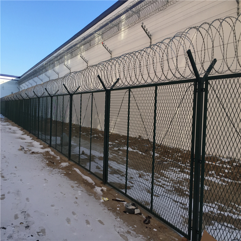 監(jiān)獄鋼網(wǎng)墻一般帶有邊框,邊框尺寸一般為20*30mm、30*40mm、30*50mm等等,邊框增強(qiáng)了鋼網(wǎng)墻的牢固性。鋼筋焊接鋼網(wǎng)墻的立柱一般采用60*60/80*80/100*100等的方形鋼管焊接而成,厚度采用3mm以上能夠有更好的牢固作用。防攀爬是監(jiān)獄鋼網(wǎng)墻必須必備的特點(diǎn),我們一般會在監(jiān)獄鋼網(wǎng)墻頂端架設(shè)蛇腹形刀刺網(wǎng)。現(xiàn)在監(jiān)獄架設(shè)的蛇腹形刀刺網(wǎng)型號為BTO-22型號,根據(jù)規(guī)定不同的地方架設(shè)的刀刺網(wǎng)圈經(jīng)不一樣,一般有φ50cm、φ60cm、φ80cm。