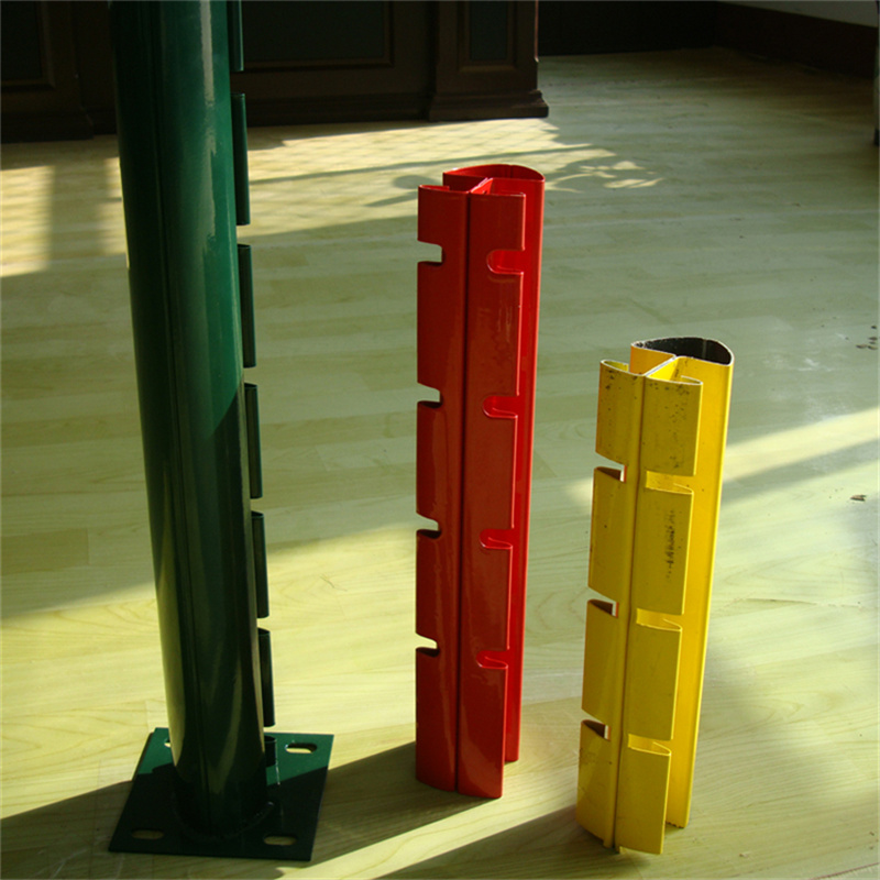 立柱的結(jié)構(gòu)描述:一般桃形立柱的板材厚度為1-1.2mm,通過機(jī)器冷壓、冷彎成型。柱體外側(cè)為橢圓型,內(nèi)側(cè)兩板相接后均各自向外彎制成U型,即為掛鉤部分。為便于桃型立柱與網(wǎng)片的連接,立柱內(nèi)側(cè)根據(jù)網(wǎng)片的網(wǎng)孔尺寸,延立柱長度方向均勻的設(shè)置N組鉤掛缺口分布于柱體兩側(cè),掛鉤U型的外部與外側(cè)的橢圓形柱體的直邊相切,有效地防止被撬開,保證了護(hù)欄的防撬安全性能。