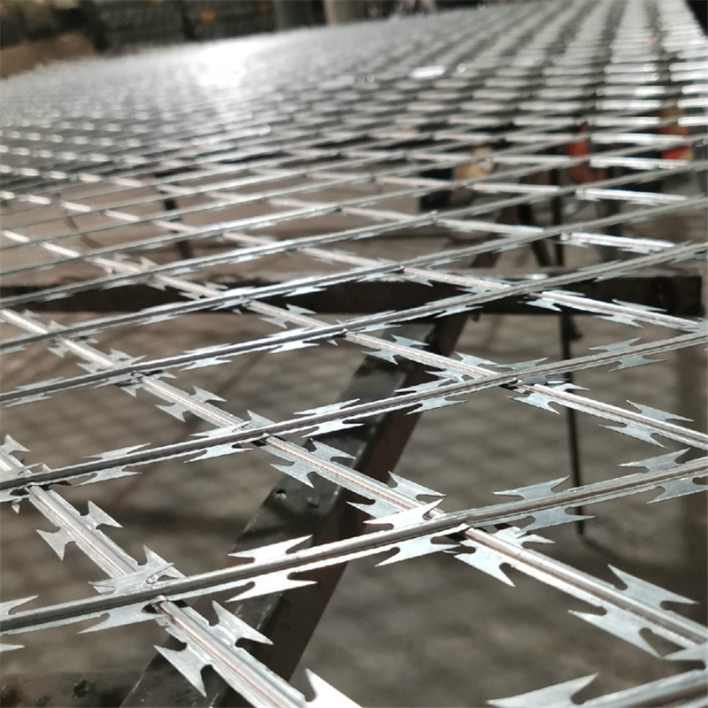 1、網(wǎng)片:寬約2500mm*高約2250mm;分上下兩層結(jié)構(gòu),總高約4.5米;上下層之間邊耳連接,確保網(wǎng)片不變形。    2、網(wǎng)孔及絲徑:高純度合金低碳鋼直線型刀刺圈:BTO一22型,蕊絲直徑2.5mm。刀長(zhǎng)22mm,刀寬15mm,厚度0.5mm,刀間距35mm。規(guī)格約:70mm×150mm,橫筋與豎筋?yuàn)A角60度角或120度角。3、網(wǎng)片固定框:40×20×2.0mm鍍鋅方鋼管。每網(wǎng)片框增加一道方管垂直中稱。固定邊框與刀片焊接網(wǎng)通過兩邊方鋼焊接連接,刀片焊接網(wǎng)居于固定邊框中間線,兩連接方鋼與刀片焊接網(wǎng)焊接于固定邊框中央;連接方鋼尺寸:15mmX2.5mm。