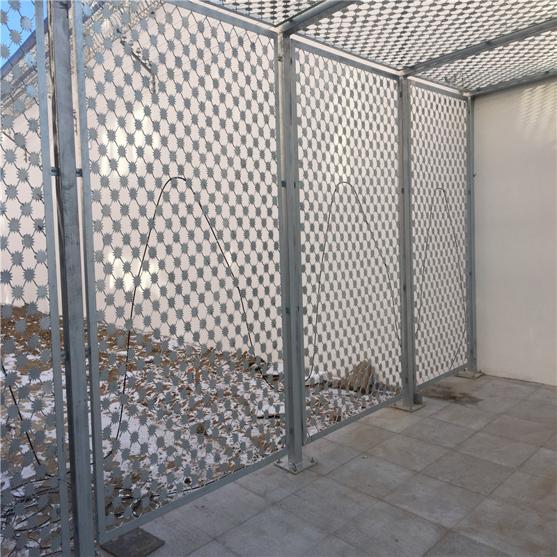 監(jiān)獄梅花刺鋼網(wǎng)墻又稱監(jiān)獄護欄網(wǎng)或監(jiān)獄隔離柵,主要是采用高強度的刀片刺網(wǎng)與普通防護網(wǎng)的結(jié)合,由V型支架立拄,加強型焊接片網(wǎng),安全防盜連接件和刀片刺網(wǎng)組成。刀片刺網(wǎng)是一種新型防護網(wǎng),由銳利尖角鍍鋅鋼板或不銹鋼薄板做刀片,鋼絲做芯線組合而成的防護器材梅花刺網(wǎng)又稱高安全防護網(wǎng)、監(jiān)獄防護網(wǎng),是用氬弧焊將梅花形刺片焊接在美格網(wǎng)的節(jié)點上,形成刺形保護,有效的防止了手握腳攀,為此該鋼網(wǎng)墻在監(jiān)獄或看守所使用。