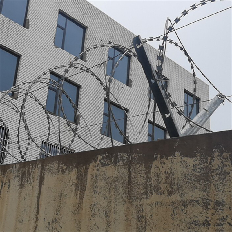 圍墻為了起到防盜的作用也是有很多的變化,從最開始在上面布置玻璃碎片到現在使用刀片刺繩等等,更加簡單更加強悍的防護效果保障了公民的生命和財產安全,說一下刀片刺繩的安裝方法:刀片刺繩每2圈有3-7個卡扣,而且是圈圈相卡,拉開以后形成螺旋狀,拉伸的時候注意一定要帶防護手套,預防劃傷。拉開的時候只需要固定刺網的一邊,然后向相反方向拉開就行,注意孔的間距不要太大,不然影響美觀效果。收的時候只要慢慢的送回去就行,操作簡單,施工便利。