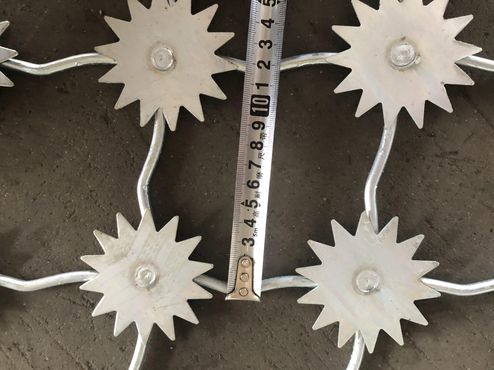 1、梅花刺防沖隔離網(wǎng)為單層梅花刺片網(wǎng),直徑不小于7.5cm,刺片厚1.5mm,采用Q235低碳鋼板沖壓成型。