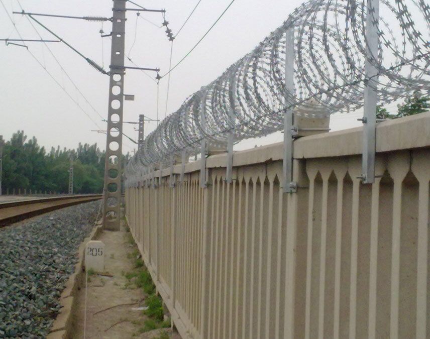 (5)安裝好支架立柱了,先把要安裝刀片刺繩的拉絲給固定上,然后利用拉絲的支撐力來(lái)安裝刀片刺繩,并用專用的卡扣、卡鉗進(jìn)行固定。