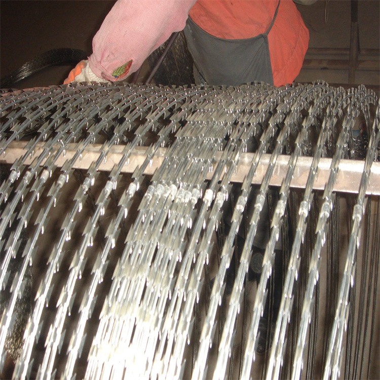 鋅層不低于270G/平方米。以免造成不必要的損失。是在兩條刀片刺網(wǎng)之間以不銹鋼片和鍍鋅鋼片強力夾扣,刀片刺網(wǎng)由熱鍍鋅鋼板或不銹