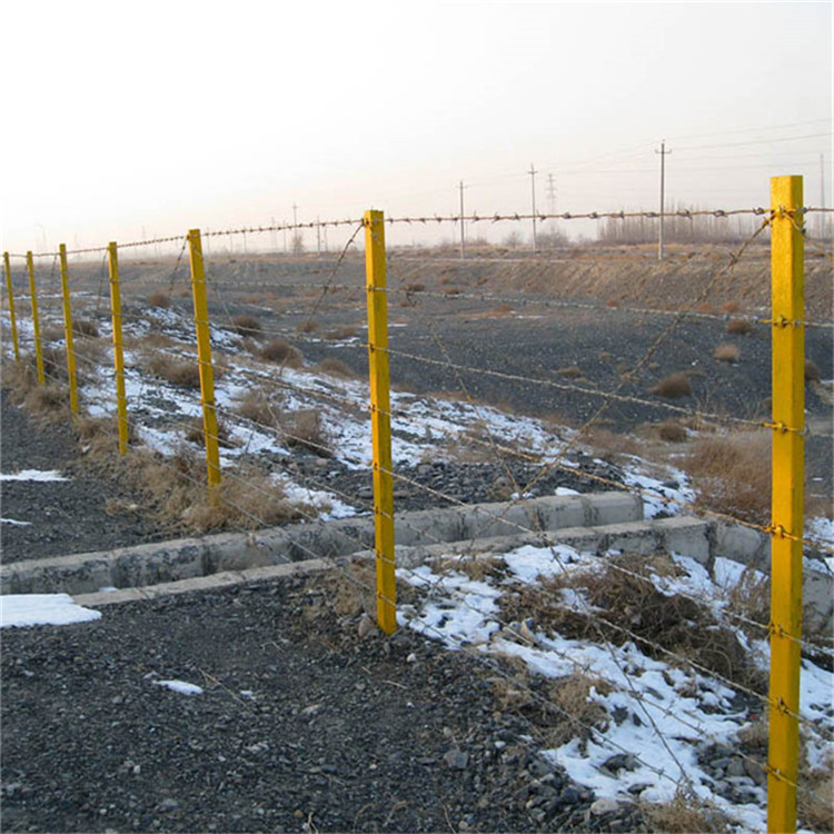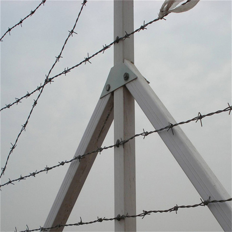 4)刺鋼絲安裝時要從端頭立柱開始,刺鋼絲之間要平行、平直;繃緊后用鋼絲與立柱上的鉤扣綁扎固定,橫向與斜向刺鋼絲相交處也要用鋼絲綁扎。