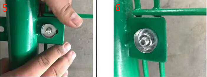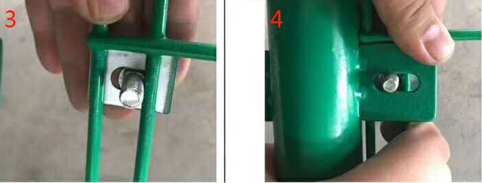 ④:安裝網(wǎng)片:確定網(wǎng)片位置,將立柱耳朵與安裝孔位對齊用螺絲固定即可。
