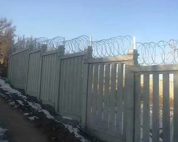 刀片刺繩采用刀片刺繩繞圈后相鄰兩圈每隔120度用刺絲連接卡固定,張開后形成蛇腹網(wǎng)狀,閉合后刀片刺繩卷徑為50cm,張開后每交叉圈安裝間距20cm,直徑不小于45cm。刀片刺繩由刺絲連接卡扣與固定在支架上的縱向拉筋相連接,縱向拉筋與支架的連接采用Φ2.5mm的冷拔鍍鋅鋼絲繞2圈后擰緊固定,支架(土字支架)設(shè)置跨度3m,中間需增加一個加密支架(一字支架),支架與防護柵欄采用支架抱箍連接,對于已經(jīng)安裝金屬網(wǎng)片的防護柵欄,刀片刺繩直接采用Φ2.5mm的冷拔\鍍鋅鋼絲或刺絲連接卡扣固定于金屬網(wǎng)橫片和金屬絲上。
