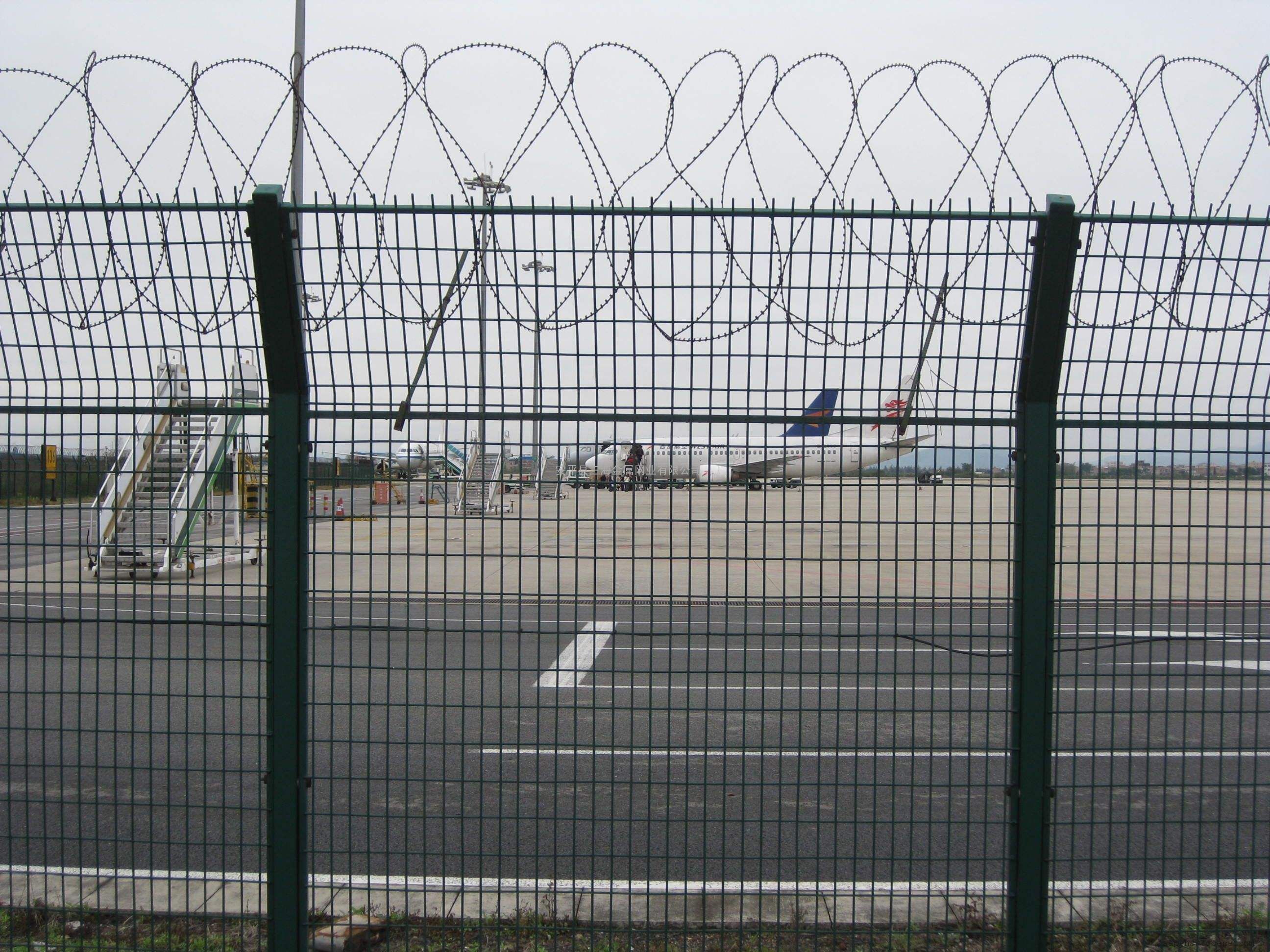 3.機(jī)場跑道護(hù)欄網(wǎng)頂部應(yīng)設(shè)有防翻越裝置,并加裝蛇腹型刀刺圈,刺圈直徑500mm,刺圈間距20cm—25cm,應(yīng)使用標(biāo)準(zhǔn)件與網(wǎng)片聯(lián)接牢固。