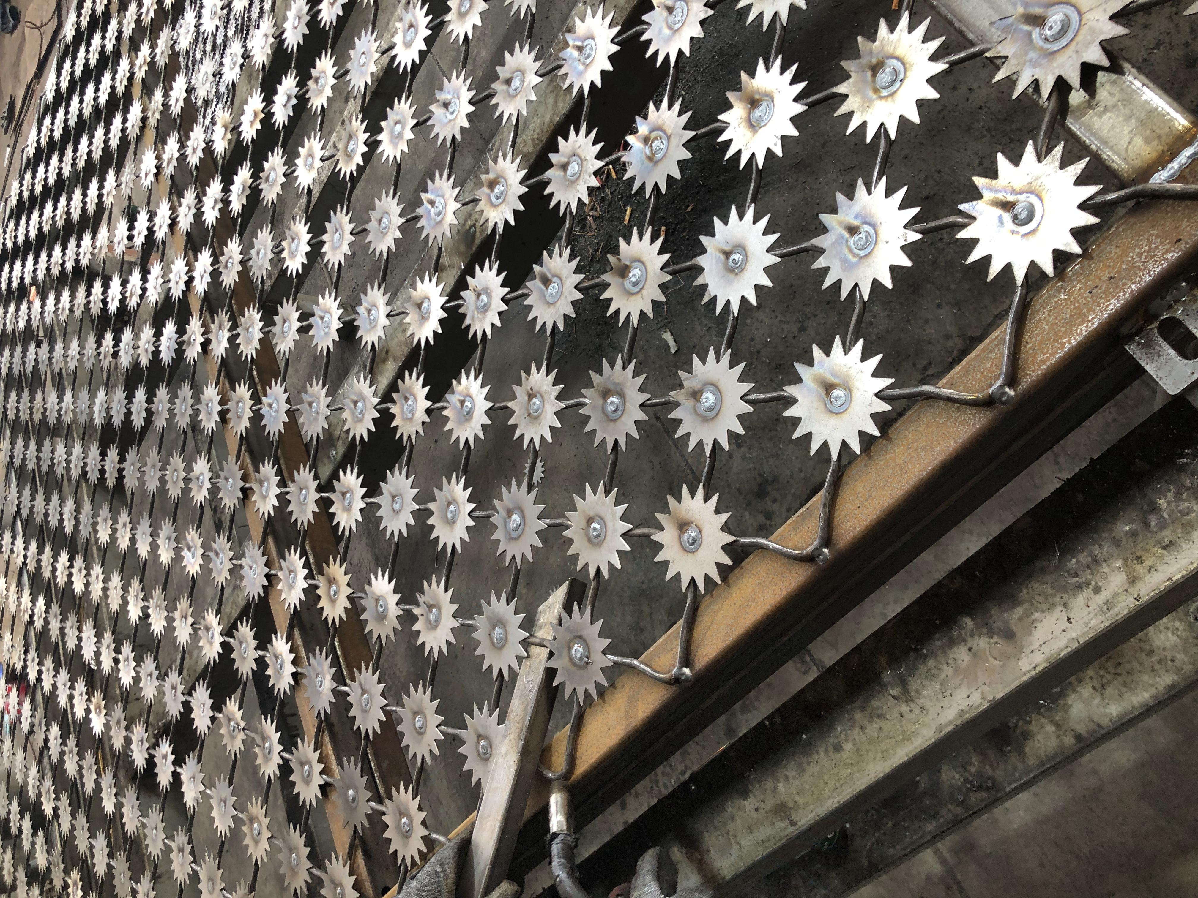 2、網(wǎng)片為菱形網(wǎng)孔,網(wǎng)格尺寸:120mm*110mm(高*寬),網(wǎng)絲直徑8mm,采用S195線(xiàn)材高壓焊接,每一個(gè)焊點(diǎn)附焊梅花刺一個(gè)。