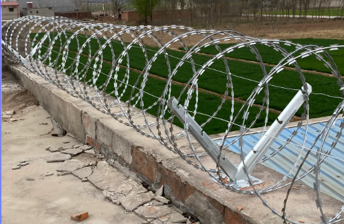 支架的安裝:支架是安裝刀片刺繩專用的支架,在安裝的時候是3米一個,打膨脹螺絲,法蘭盤固定。