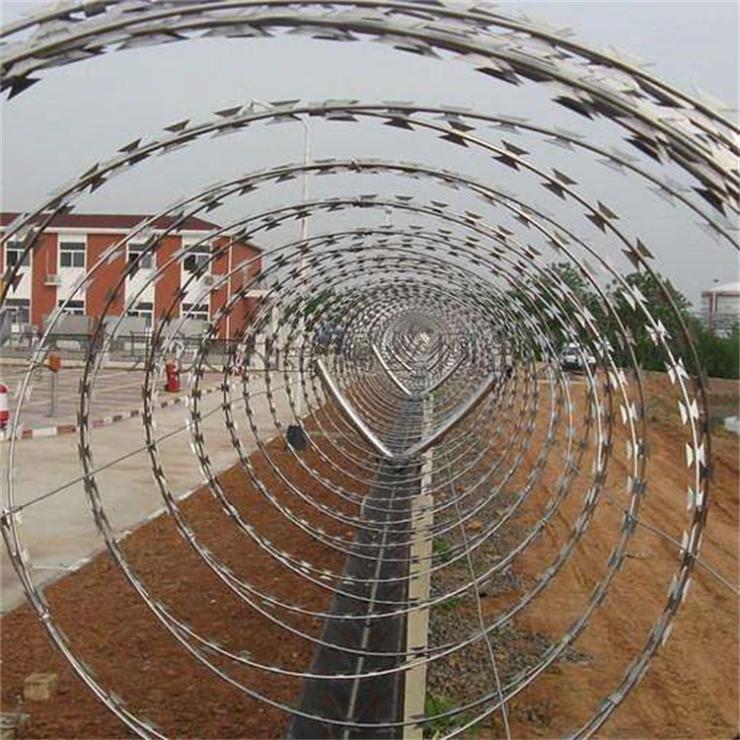 工藝:浸塑刀片刺繩支架是由圓管或方管切割成兩個臂長為45cm的管,然后焊接到地盤上,組成v字型狀。所以叫v型支架,v型支架主要與刀片刺繩組合,給圍墻加一層保護膜。