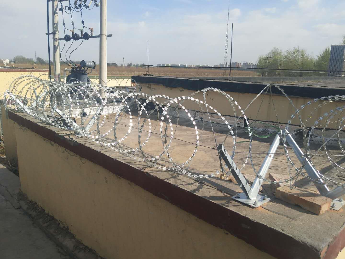 院墻刺絲滾籠芯線材質(zhì):采用優(yōu)質(zhì)的熱鍍鋅高碳鋼絲、熱鍍鋅中碳鋼絲、不銹鋼線等。刀板材質(zhì):采用優(yōu)質(zhì)的--熱鍍鋅鋼板。不銹鋼板。工藝:刀片刺繩由熱鍍鋅鋼板或不銹鋼薄板沖壓出尖銳的刀片狀,高張力鍍鋅鋼絲或者不銹鋼絲做芯線組合而成的阻絕器材。由于刺網(wǎng)造形獨(dú)特不易觸摸,院墻刺絲滾籠特點(diǎn):