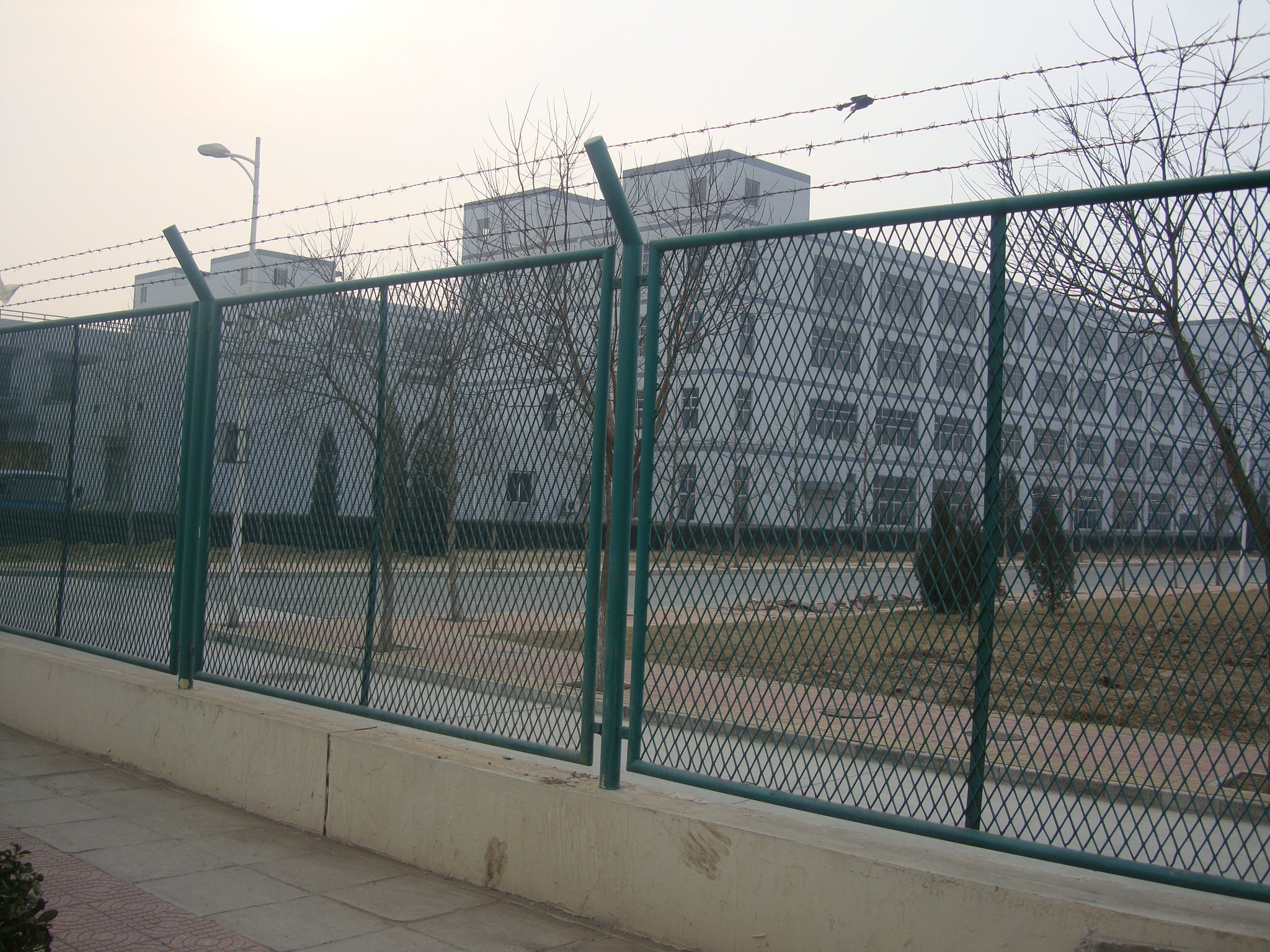 金屬護(hù)欄網(wǎng)圍墻一般采用低碳鋼絲作為主要材料,具有耐腐蝕、耐磨損、抗拉強(qiáng)度高等特點(diǎn),采用框架結(jié)構(gòu),邊框可使用方管、圓管或角鋼,立柱采用Y型立柱,頂部安裝防爬刀刺網(wǎng),高度也可根據(jù)現(xiàn)場(chǎng)要求定制,以確保足夠的防護(hù)效果。包括頂部應(yīng)設(shè)置的刀刺網(wǎng),以有效防止人員攀爬。這種架構(gòu)形式能提供更好的視野和通風(fēng)效果。邊框網(wǎng)結(jié)構(gòu)相對(duì)于磚墻來(lái)說(shuō)具有更大的網(wǎng)眼和更少的遮擋物,能夠提供更好的視野和通風(fēng)效果,使得環(huán)境更加明亮和通風(fēng)。