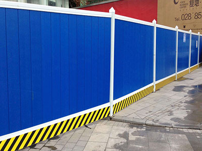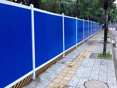 圍擋基腳采用M10水泥砂漿砌筑MU10頁巖磚磚砌0.5*0.5的基礎(chǔ),用于增強(qiáng)圍擋抗風(fēng)穩(wěn)定性;pvc圍擋設(shè)2.5米高,寬3米為一板。施工圍擋做美化處理,噴涂企業(yè)名稱、安全、質(zhì)量、文明施工用語及開發(fā)項(xiàng)目商業(yè)廣告,嚴(yán)禁張貼、涂寫垃圾廣告。