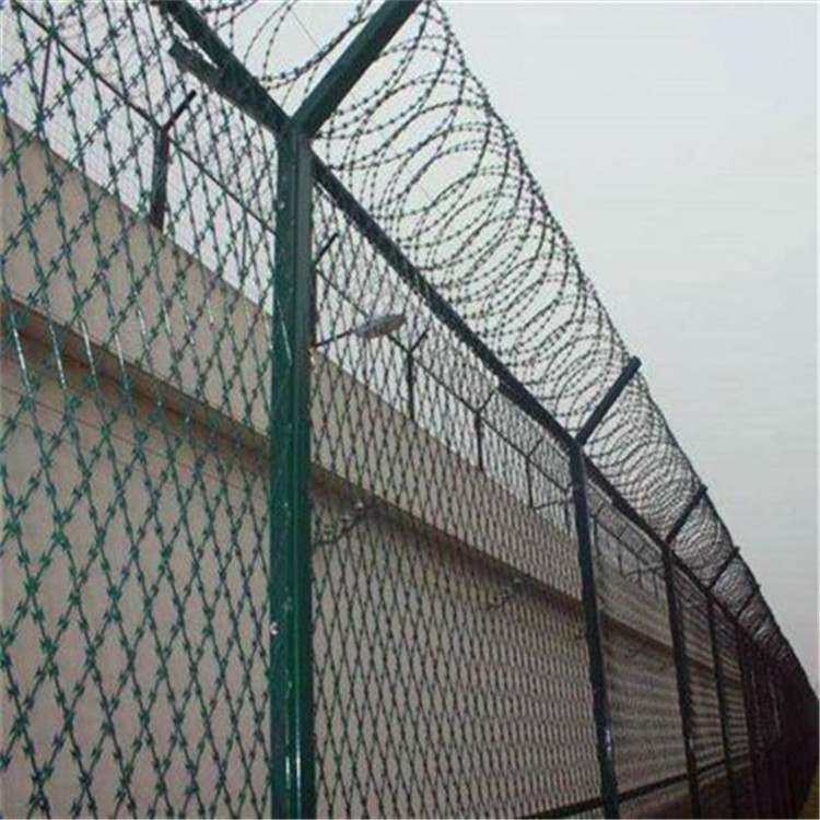 監(jiān)獄防護(hù)網(wǎng)又稱監(jiān)獄護(hù)欄網(wǎng)或監(jiān)獄隔離柵,主要是采用高強(qiáng)度的刀片刺網(wǎng)與普通防護(hù)網(wǎng)的結(jié)合,由V型支架立拄,加強(qiáng)型焊接片網(wǎng),安全防盜連接件和刀片刺網(wǎng)組成.刀片刺網(wǎng)是一種新型防護(hù)網(wǎng),由銳利尖角鍍鋅鋼板或不銹鋼薄板做刀片,鋼絲做芯線組合而成的防護(hù)器材.監(jiān)獄圍欄網(wǎng)刀片刺網(wǎng)具有嚇阻、防翻越等效果,材質(zhì)堅(jiān)硬,高強(qiáng)度,高張力,造型設(shè)計(jì)獨(dú)特,不宜觸摸,因而能達(dá)到極好的防護(hù)隔離效果.監(jiān)獄護(hù)欄網(wǎng)還具有施工簡(jiǎn)便,經(jīng)濟(jì)實(shí)用等優(yōu)點(diǎn).